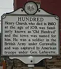 La ville doit son nom (« cent » en français) à Henry Church, surnommé Old Hundred et mort à l'âge de 109 ans en 1860[1],[2]. Elle est la seule localité à porter ce nom dans tous les États-Unis.