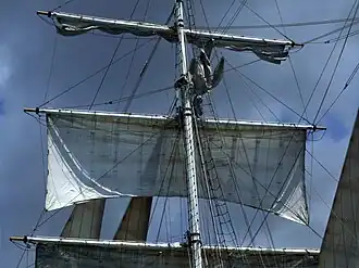- Mât d'artimon : Hunier fixe de fougue ou perroquet de fouge (bas) et hunier volant de fougue ou volant d'artimon (haut)[2]