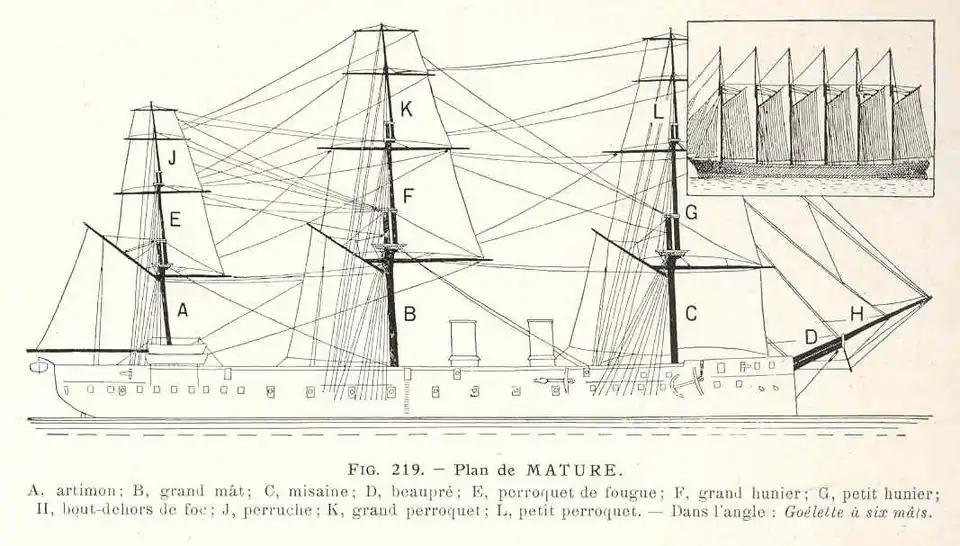 - Trois-mâts goélette ou barquentin : un mât à voiles carrées (avec huniers) et deux mâts à voiles auriques à l’arrière.