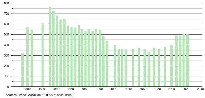 L'évolution du nombre d'habitants est connue à travers les recensements de la population effectués dans la commune depuis 1793. Pour les communes de moins de 10 000 habitants, une enquête de recensement portant sur toute la population est réalisée tous les cinq ans, les populations de référence des années intermédiaires étant quant à elles estimées par interpolation ou extrapolation[17]. Pour la commune, le premier recensement exhaustif entrant dans le cadre du nouveau dispositif a été réalisé en 2006[18].