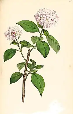 Des plants vivants provenant de Chine furent importés en Angleterre au jardin de Kew par Joseph Banks en 1789. C'était une variété à grosses inflorescences globuleuses rose pâle.