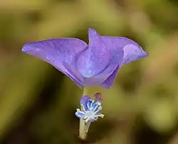 - fleur non décorative (en dessous) cinq petits sépales verdâtres (2 mm), cinq pétales (4-5 mm) bleus, dix étamines, trois styles.