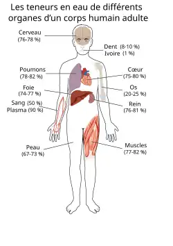 La composition du corps humain (en) montre que l'eau n'y est pas répartie uniformément, certains organes en contiennent plus que d'autres. La teneur en eau de la peau est de 67 à 73 %. La répartition de l'eau dans les couches superficielles de la peau n'est pas homogène, le gradient hydrique cutané montrant une baisse au fur et à mesure que l'on s'approche de la surface cutanée : le derme (principal réservoir d'eau — 7 à 8 kg — de la peau, qui diffuse des couches externes dermiques et gagne, après migration transépidermique, les espaces intercornéocytaires) présente une teneur en eau de l'ordre de 80 %, l'épiderme profond une teneur en eau constante de l'ordre de 70 %. Cette teneur chute à 25-30 % à l'interface couche granuleuse-couche cornée, et atteint 15-20 % dans la couche cornée d'une peau normalement hydratée[6].