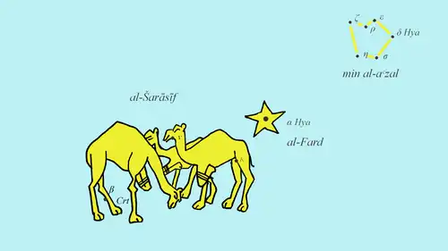 Mais les Arabes voyaient aussi, dans leur ciel traditionnel, à côté d’al-Fard, « l’Isolée », un groupe nommé الشراسيف al-Šarāsif, « les Chameaux entravés », et un ensemble situé au nord-est de ces figures, décrit comme العزل من min al-aᶜzal, c’est-dire « à l’écart ». Toutes ces figures ont donné des noms qui se retrouvent aujourd’hui dans le catalogues internationaux : Alphard [Hydrae] (α Hya), Al Sharasif [Hydrae] (κ Hya), Min Azal I à V (δεζρσ Hya, et Sharasiph (ν Hya).