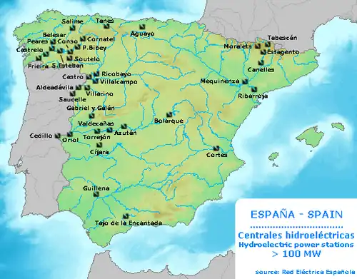 La centrale hydroélectrique la plus puissante est celle du barrage d'Aldeadávila dans la province de Salamanque, à la frontière avec le Portugal, sur le Río Duero : 1 147 MW (production annuelle : 2 300 GWh), suivie par le réservoir José María de Oriol-Alcántara II sur le Tage (province de Cáceres) : 915 MW. D'autres centrales de capacité supérieure à 500 MW sont celles de Cortés-La Muela sur le Júcar (Valencia), Almendra (810 MW, 1 376 GWh/an ; appelée aussi Saut de Villarino) sur le Tormes (Salamanque) et Saucelle (525 MW) sur le Duero (Salamanque)[16].