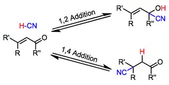 Les conditions acides favorisent généralement les adduits 1,2 tandis que les conditions basiques favorisent plutôt les adduits 1,4. L'addition de cyanures métalliques alcalins, par exemple, conduit exclusivement à une addition 1,4[8]. Par opposition aux cyanures métalliques et cyanoaluminates alcalins, les cyanures acides au sens de Lewis, comme le cyanure de triméthylsilyle (CH3)3SiCN, favorisent les additions 1,2. Les substrats acétyléniques peuvent faire l'objet de cette réaction mais les réactions possibles sont limitées et les rendements sont souvent faibles[9].