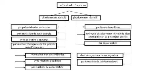 La figure suivante illustre les méthodes les plus couramment utilisées[5] pour la synthèse d'hydrogel :