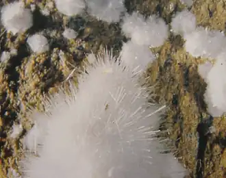 | Habitus | rares petits cristaux aciculaires ou en feuillet ou en lamelles aplaties; agrégat cristallins, fibreux, à aspect crayeux fissuré ou compact, rosette de cristaux lamellaires à terminaison aiguë ; petites touffes radiées, masses compactes ou crayeuse (friables); recouvrement massif, crayeux, incrustations fibreuses radiées, granulaires ou terreuses... |