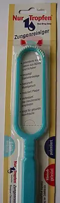 • Brosse à langue (en): comportant des poils plus courts et plus durs, elle permet d'assurer l'hygiène de la langue et de réduire la quantité de peaux mortes, riches en bactéries qui participent à la formation de la plaque dentaire. Il est aussi possible de brosser sa langue avec la brosse à dents, qui d'ailleurs inclut parfois au dos un racloir pour la langue.