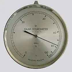 L'hygromètre à cheveux naturels utilise la propriété que possède le cheveu, préalablement dégraissé, de voir sa longueur varier en fonction du degré hygrométrique de l’air. Cet allongement est de l'ordre de 2,5 % lorsque l'humidité relative varie de 0 à 100 %[9],[18] ; il n’est, toutefois, pas proportionnel à celle-ci et est nettement plus faible lorsqu’on approche de 100 %[19] ; ceci explique que la graduation du cadran d’un tel hygromètre n’est pas linéaire.