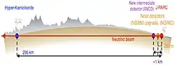 - Le détecteur principal, également appelé Hyper-Kamiokande (HK), est en cours de construction sous le pic du mont Nijuugo dans la ville de Hida, dans la préfecture de Gifu, dans les Alpes japonaises (36° 21′ 20,105″ N, 137° 18′ 49,137″ E). Le détecteur HK sera utilisé pour les recherches de désintégration du proton, les études des neutrinos provenant de sources naturelles et servira de détecteur lointain pour la mesure des oscillations du faisceau de neutrinos à la distance correspondant au premier maximum d'oscillation[3]:53–56[5].