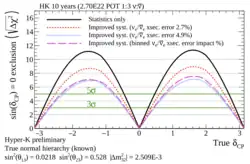 La comparaison des probabilités d'apparition des neutrinos et des antineutrinos électroniques ( versus ) permet de mesurer la phase . Celle-ci varie de à (de -180° à +180°) et les valeurs et correspondent à la consrvation de la symétrie CP. Après 10 années de prise de données, HK devrait confirmer à un niveau de confiance d'au moins si la symétrie CP est violée dans les oscillations de neutrinos pour 57% des valeurs possibles de . La violation de cette symétrie est l'une des conditions nécessaires pour produire un excès de matière (supposée avoir été produite en quantité égale avec l'antimatière) dans l'univers primordial, ayant pour conséquence l'univers composé uniquement de matière que l'on observe aujourd'hui. Les neutrinos du faisceau seront également utilisés pour améliorer la précision de la mesure des autres paramètres d'oscillation, , et , et pour réaliser des mesures des paramètres des modèles d'interaction des neutrinos.