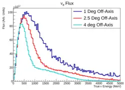 - ↑ L'énergie moyenne des neutrinos diminue quand l'angle par rapport au faisceau augmente.