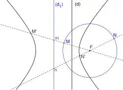 - une hyperbole de foyer F, de directrice (d) et d'excentricité e est l'image du cercle de centre F et de rayon eh (où h est la distance entre le foyer et la directrice) par l'homologie harmonique de centre F et d'axe (d1) image de (d) dans l'homothétie de centre F et de rapport 2[5] ;