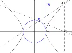 Cercle principal : c'est le cercle de diamètre [SS']. Foyer et directrice sont en relation pôle/polaire par rapport au cercle principal. Le cercle principal, privé de ses intersections avec les asymptotes, est également la podaire de l'hyperbole par rapport à l'un des foyers, c'est-à-dire le lieu des projetés orthogonaux de ce foyer sur les tangentes[18], ce qui fait de l'hyperbole, l'antipodaire de son cercle principal par rapport à un de ses foyers.