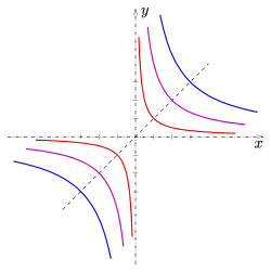 Réciproquement, si deux droites de vecteurs directeurs et se coupent en O et si une courbe, dans le repère , a pour équation où k est un réel non nul, alors cette courbe est une hyperbole[6].