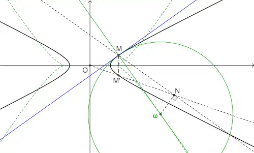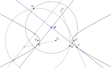 Par le point O ou un point M intérieur à l'hyperbole, il ne passe aucune tangente, par un point situé sur l'hyperbole ou sur une asymptote (distinct de O), il en passe une seule et par un point situé à l'extérieur de l'hyperbole, non situé sur les asymptotes, il passe toujours deux tangentes[20]. Pour construire les deux tangentes issues de M, il suffit de tracer le cercle de centre M passant par un foyer F et le cercle de centre F' et de rayon 2a. Les cercles se rencontrent en N et N', les médiatrices de [FN] et [FN'] sont les tangentes recherchées[21]. Pour trouver le point de contact, il suffit de construire une parallèle à la tangente coupant l'hyperbole en deux points, la droite passant par O et par le milieu de la corde ainsi construite rencontre la tangente en son point de contact. Ou bien, on prend le symétrique d'un des foyers par rapport à la tangente, la droite joignant ce symétrique à l'autre foyer rencontre la tangente à son point de contact[22].