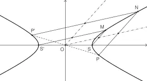 Soit M un point de l'hyperbole de sommets S et S' et de centre O. Si par un point N de l'hyperbole, on mène des parallèles à (SM) et (S'M), elles rencontrent l'hyperbole en deux points P et P' symétriques par rapport à O[10]. Par conséquent, dans un faisceau de droites parallèles (di) rencontrant l'hyperbole, les milieux des cordes que déterminent ces droites sur l'hyperbole, sont alignés avec le centre O de l'hyperbole. De plus, si M est le point de l'hyperbole tel que (SM) soit parallèle à (di) alors la droite des milieux est parallèle à (S'M)[11]. Une telle droite passant par le centre de l'hyperbole est appelée diamètre de l'hyperbole[12].