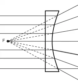 Cette relation entre foyer, directrice et excentricité dans une hyperbole est exploitée dans la construction des lentilles divergentes : si l'indice de la lentille par rapport au milieu est de , et si la surface concave de la lentille est une hyperbole de foyer et d'excentricité , le faisceau de rayons parallèles traversant la lentille, se disperse comme si les rayons venaient du foyer [2].