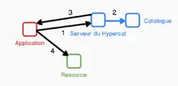 Le concept de l’interaction entre les applications et le HyperCAT commence par un message envoyé par HTTP/S de l’application au serveur du HyperCAT (Figure 1, numéro 1). L’application reçoit ensuite un fichier du HyperCAT qui contient un catalogue de toutes les ressources disponibles (Figure 1, numéro 2) et de là, l’application peut interagir avec ces ressources (Figure 1, numéro 3) en suivant les protocoles spécifiés par le HyperCAT[5].