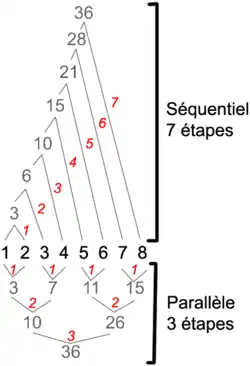 Pour avoir une idée du gain en performances en utilisant des machines parallèles, considérons l'addition de nombres. Sur une machine séquentielle, on additionne le premier nombre avec le second, puis on rajoute le troisième, etc., Au total, étapes sont nécessaires. Sur une machine parallèle, chaque processeur réalise l'addition d'une paire de nombres en une étape, puis les résultats de deux paires sont additionnés, etc. Au total, étapes sont nécessaires. Ainsi, pour 1 000 nombres, une machine séquentielle utilisera 999 étapes tandis qu'il n'en faut que 11 sur une machine parallèle ; un autre exemple est illustré ci-contre. Le gain est encore plus significatif pour d'autres opérations, par exemple une instance d'inversion de matrice peut nécessiter 40 000 étapes sur une machine séquentielle contre 61 sur une machine parallèle[A 6].