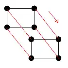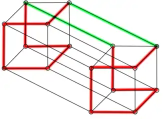 - Cycles. Par construction, le plus petit cycle correspond à , qui est isomorphe au cycle (i.e. le cycle de longueur 4). Le graphe est formé par deux graphes : si l'on souhaite un cycle de longueur supérieur à 4 dans , alors on choisit arêtes dans un des deux graphes , arêtes dans l'autre et 2 arêtes supplémentaires pour naviguer entre les deux graphes, ce qui porte le total d'arêtes à ; ce mécanisme est illustré dans la figure ci-contre avec un cycle de longueur 6, et permet de prouver que les cycles dans un hypercube sont toujours de longueur paire.