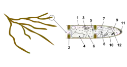 - chez des algues (le terme « hyphe » désigne alors les filaments cloisonnés internes qui constituent par exemple la moelle des laminaires).