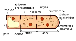 Les hyphes s'allongent par leur apex. Contrairement aux cellules animales ou végétales, la « cellule fongique » ne se divise pas[3]. La croissance se fait uniquement à son sommet. Elle peut s'accompagner de la formation de « cloisons » délimitant une structure ressemblant à une cellule et qu'on appelle article. Chez certaines espèces, ces cloisons sont percées d'un trou, appelé pore. Ils assurent une connexion entre les articles voisins.