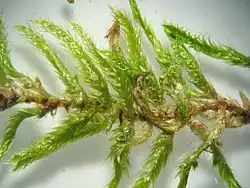 Plante vivace rampante de 3 à 10 cm de long, elle porte des rameaux arrondis couchés ou dressé, souvent d'un vert assez sombre. La ramification est irrégulièrement pennée. Les feuilles couvrent totalement la tige, sont falciformes à longues pointes effilées, toutes tournées vers le substrat et à marge souvent denticulée vers l'apex[3],[4]. Les coins de la base des feuilles présentent un groupe de cellules différenciées, appelées cellules allaires. Chez cette espèce les cellules allaires forment un creux dans la feuille.