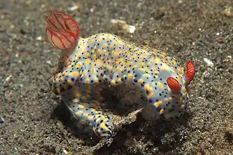 Les rhinophores lamellés ont une base blanche et le bord des lamelles est rouge. Le bouquet branchial a sa base blanche et les branchies sont blanches et surlignées de rouge.