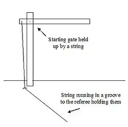 Au moment du départ, l'arbitre lâche l'ensemble des cordes : les barres mobiles tombent par gravité et libèrent le passage devant les coureurs[2].