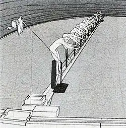 Il consiste en la combinaison de deux barres maintenues ensemble autour d'un point, l'une étant fixée à la verticale du sol sur la ligne de départ, l'autre pouvant se mouvoir, grâce à la tension d'une corde, dans le plan de la ligne de départ perpendiculaire au sol. Un système replaçant la barre mobile par deux cordes a pu aussi exister[1].