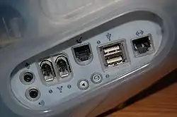 | Périphériques | 4 ports USB 1.1 2 ports FireWire 400 (sauf pour l’iMac à 350 MHz) 2 ports pour écouteurs Port analogue miniature pour l’entrée audio Haut‑parleurs stéréo intégrés | |||