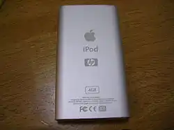 Annoncée le et concrétisée le , une alliance commerciale entre Apple et HP permet à ce dernier de vendre des iPod sous sa marque. Contrairement au prototype montré en janvier qui était bleu, le produit final, un iPod de quatrième génération (20 ou 40 Go) est difficilement différentiable de l'iPod Apple. La seule différence est la présence du logo HP sur la face postérieure de l'iPod sous la pomme Apple et le logo iPod[32].