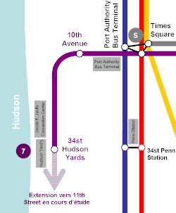 L'extension de la ligne 7, aussi connue sous le nom de Hudson Yards Rezoning and Development Program (« Programme de rezonage et de développement des Hudson Yards ») consiste en une prolongation de la ligne de 2,4 km (1,5 mile) en direction de l'ouest et du sud, à partir du terminus actuel à 42e rue-Times Square. Alors que le plan initial prévoyait deux nouvelles stations, la première au croisement de la 41e rue et de la Dixième Avenue et la seconde plus au sud au croisement entre la 34e rue et de la Onzième Avenue, la première a été retirée des plans en [18]. Elle pourrait cependant être réintégrée si des financements peuvent être trouvés[19]. L'ouverture de la nouvelle ligne, initialement prévue pour a été repoussée à , et le reste de la nouvelle station sur la 34e (en) rue devrait être terminé fin 2015. Le budget de l'extension de la ligne est de l'ordre de 2,4 milliards de dollars[20].