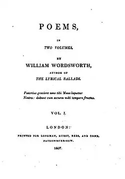 Poems, in Two Volumes, obtient des critiques défavorables des contemporains de Wordsworth, notamment de Lord Byron, que Wordsworth méprise[15]. Byron écrit du volume, dans une de ses premières critiques, "M. W [ordsworth] cesse de plaire, ... habillant [ses idées] dans un langage non pas simple, mais puéril"[16]. Wordsworth lui-même écrit pour anticiper les critiques de The Critical Review, espérant que son ami Francis Wrangram ferait pression pour une approche moins sévère. Il réussit à empêcher un ennemi connu de rédiger la revue, mais cela n'a pas aidé; comme l'a dit Wordsworth lui-même, il s'agissait de "passer de la poele à frire au feu". Parmi les points positifs de Poems, in Two Volumes, on compte la masculinité perçue dans " The Happy Warrior ", écrite sur la mort de Nelson et peu susceptible d'être l'objet d'une attaque. Des poèmes comme «I Wandered Lonely as a Cloud» ne pouvaient pas en être plus éloignés. Wordsworth réagit stoïquement aux critiques[11].