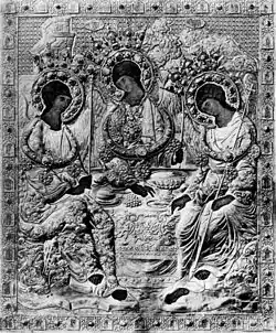 La tradition byzantine représentait la Trinité sous la forme symbolique de trois anges reçus à la table d'Abraham, appelée Philoxénie d'Abraham[8].