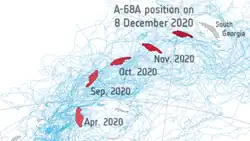- Le 4 novembre 2020, il a été signalé que l'A-68A - qui mesurait alors encore environ 148 × 47 km[11] - approchait de l'île de Géorgie du Sud, après avoir parcouru environ 2 300 km et était très susceptible de s'échouer sur le plateau continental moins profond près de l'île[12].
