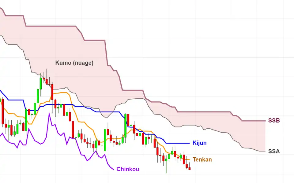 | Baissier moyen | Au-dessous du nuage | Tenkan < Kijun | Dans le nuage | Au-dessous du prix |