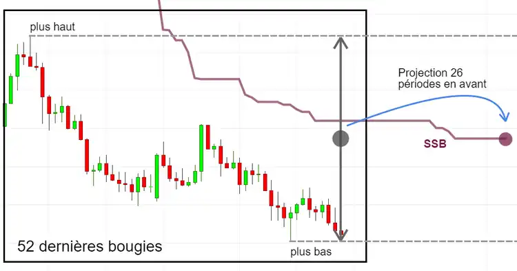 Deuxième frontière du nuage, abrégée en « SSB ». Il s'agit du milieu du plus haut et du plus bas des 52 dernières périodes, projeté 26 périodes en avant (on peut la voir comme une Kijun sur 52 périodes mais décalée vers l'avant). La SSB est une ligne « plus forte » que la SSA dans le sens où sa période est plus grande. En d'autres termes, elle est plus difficile à traverser et peut faire office de support/résistance.