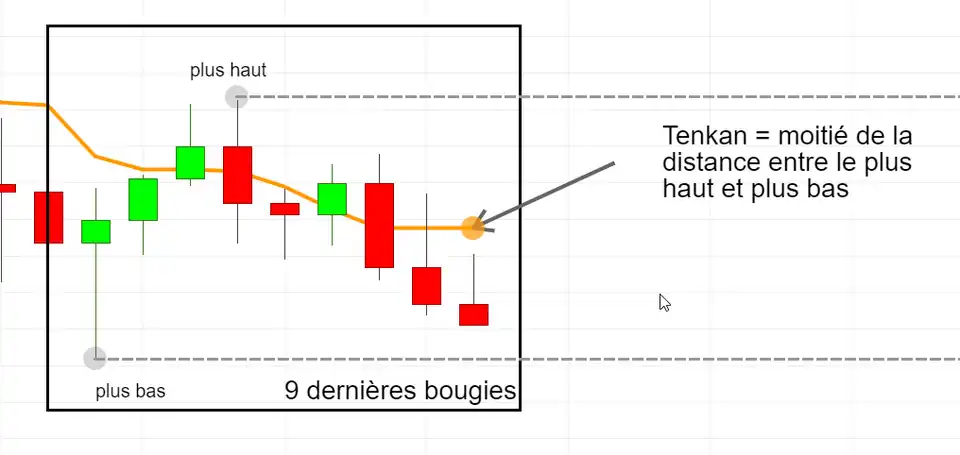 Souvent abrégée en « Tenkan » ou TS, il s'agit du milieu entre la valeur du plus haut et la valeur du plus bas sur les neuf dernières périodes observées (en horaire une session de bourse compte neuf heures). Cela peut être vu comme le prix d'équilibre (le milieu entre le plus haut et le plus bas) sur neuf périodes de cotation :