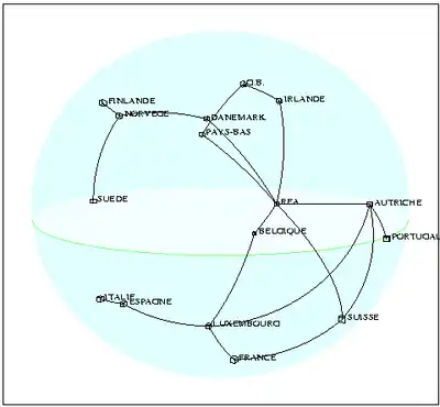 - Il s’agit d’un pis aller, car la sphère réelle n’est pas à 3 dimensions, mais à n dimensions. Si donc deux points très corrélés sont forcément proches sur le dessin, l’inverse n’est pas sûr : deux points très proches sur le dessin ne sont pas forcément corrélés. Toutefois, l’absence de lien tracé lève l’ambiguïté.