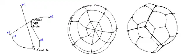 - En pratique, dans une approche logicielle, une première variable A est dessinée n'importe où sur la sphère. Puis la variable B la moins corrélée à cette première est posée sur la sphère à la distance arc-cosinus(r(A,B)) de la première. On place alors, par triangulation, la variable C la moins corrélée aux deux premières. Les autres points sont posés de proche en proche. Si la quatrième variable a une corrélation nulle avec les trois premières, il n'est matériellement pas possible de lui assigner une position exacte. Les distances sont recalculées de façon proportionnelle aux valeurs réelles. Au bout d'un certain temps, la position des premiers points est recalculée d'après les suivants. Etc. Ainsi, la figure est réajustée progressivement.
