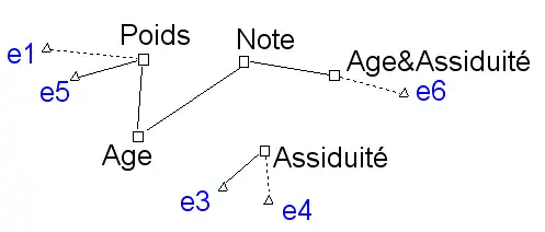 - Par rapport au schéma précédent, le lien entre note et assiduité a disparu, remplacé par les liens (Note,e6) et (Assiduité,e6) . Il était donc redondant : l’élève e6, très assidu et bien noté, explique à lui tout seul le lien (Note,Assiduité).