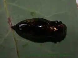 La chrysalide est de couleur marron foncé brillant.
