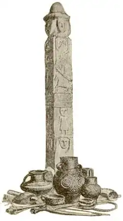 - les quatre côtés de la partie supérieure portent les plus grandes représentations de l'idole, avec quatre visages réunis sous un grand chapeau rond. Chaque côté porte un attribut distinct : un anneau ou un bracelet ; une corne à boire et un petit personnage qui semble être un enfant ; une épée et un cheval ; et un symbole solaire érodé.