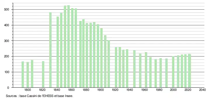 L'évolution du nombre d'habitants est connue à travers les recensements de la population effectués dans la commune depuis 1793. Pour les communes de moins de 10 000 habitants, une enquête de recensement portant sur toute la population est réalisée tous les cinq ans, les populations de référence des années intermédiaires étant quant à elles estimées par interpolation ou extrapolation[22]. Pour la commune, le premier recensement exhaustif entrant dans le cadre du nouveau dispositif a été réalisé en 2006[23]. En 2022, la commune comptait 214 habitants[Note 2], en stagnation par rapport à 2016 (Gers : +1,04 %, France hors Mayotte : +2,11 %).