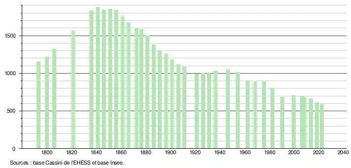 L'évolution du nombre d'habitants est connue à travers les recensements de la population effectués dans la commune depuis 1793. Pour les communes de moins de 10 000 habitants, une enquête de recensement portant sur toute la population est réalisée tous les cinq ans, les populations de référence des années intermédiaires étant quant à elles estimées par interpolation ou extrapolation[31]. Pour la commune, le premier recensement exhaustif entrant dans le cadre du nouveau dispositif a été réalisé en 2008[32].