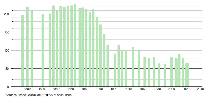 L'évolution du nombre d'habitants est connue à travers les recensements de la population effectués dans la commune depuis 1793. Pour les communes de moins de 10 000 habitants, une enquête de recensement portant sur toute la population est réalisée tous les cinq ans, les populations de référence des années intermédiaires étant quant à elles estimées par interpolation ou extrapolation[37]. Pour la commune, le premier recensement exhaustif entrant dans le cadre du nouveau dispositif a été réalisé en 2005[38].