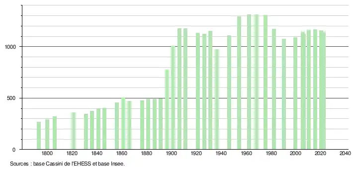L'évolution du nombre d'habitants est connue à travers les recensements de la population effectués dans la commune depuis 1793. Pour les communes de moins de 10000habitants, une enquête de recensement portant sur toute la population est réalisée tous les cinqans, les populations de référence des années intermédiaires étant quant à elles estimées par interpolation ou extrapolation[20]. Pour la commune, le premier recensement exhaustif entrant dans le cadre du nouveau dispositif a été réalisé en 2005[21].